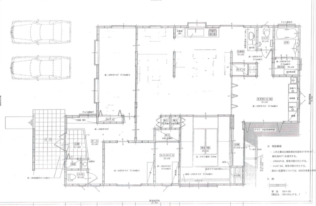 屋根付き駐車場は普通車が2台停められます